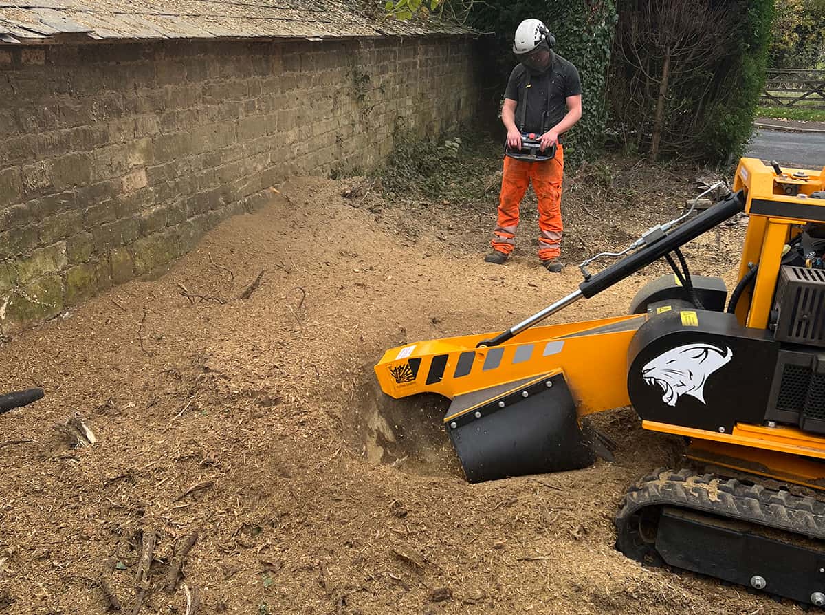 We have different types of tree stump grinders for narrow access or for the larger sites. On the front of the tree stump grinder there is a large cutter wheel that consists of large teeth, which are bolted to the cutter wheel. This removes the tree stump piece by piece. The end product will be a pile of mulch and a hole where the tree stump was. The mulch acts as a great weed suppressant on the garden, or on request we can take the mulch away free of charge. Before we start removing the tree stump we always assess the area to see if it is necessary to put out a guard system. This will ensure that no debris will cause any damage to surrounding areas and make clearing up more efficient, an important part of tree care services.